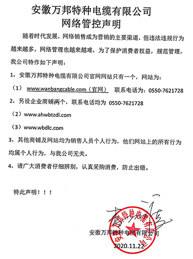 鄭重聲明:安徽萬邦特種電纜有限公司官方網站為:www_wanbangcable_com.psrnjpv.cn,除此之外無任何子網站或合作網站,其余均為假冒偽劣。電話:0550-7621728 13485756353 地 址:安徽省天長市滁州高新技術產業開發區經四路29號